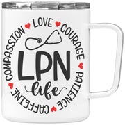 10 oz Insulated Coffee Mug 'LPN Life' with Compassion, Love, Courage, Patience, Caffeine Circle Design - Perfect Gift for Dedicated LPNs