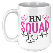 Show your nursing squad spirit and add a pop of color to your mornings. Order your 15 oz RN Squad Accent Mug today and let your passion shine through every sip!